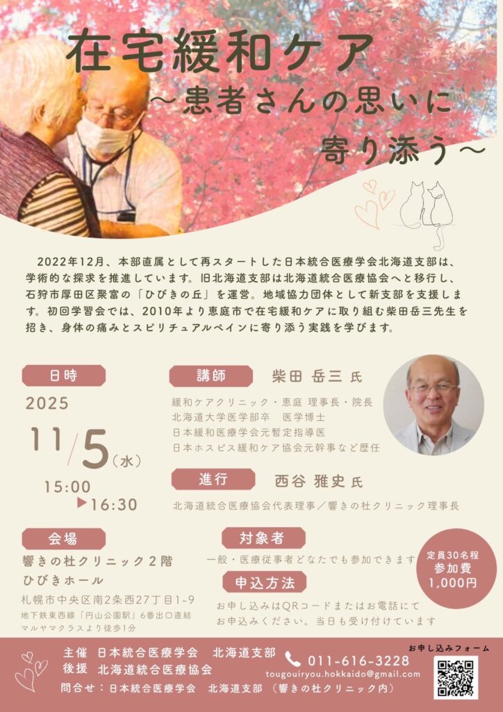 初回の学習会は「在宅緩和ケア~患者さんの思いに寄り添う~」と題し、2010年より恵庭市で在宅緩和ケアに取り組む柴田岳三先生(緩和ケアクリニック・恵庭院長)をお招きして、身体的・精神的・全人的なさまざまな「痛み」に寄り添う現場のお話をお聞かせいただきます。