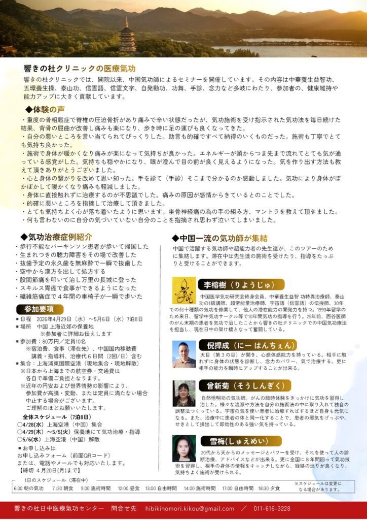 今年のゴールデンウィークに、第11回中国医療気功治療ツアーの開催を企画いたします。